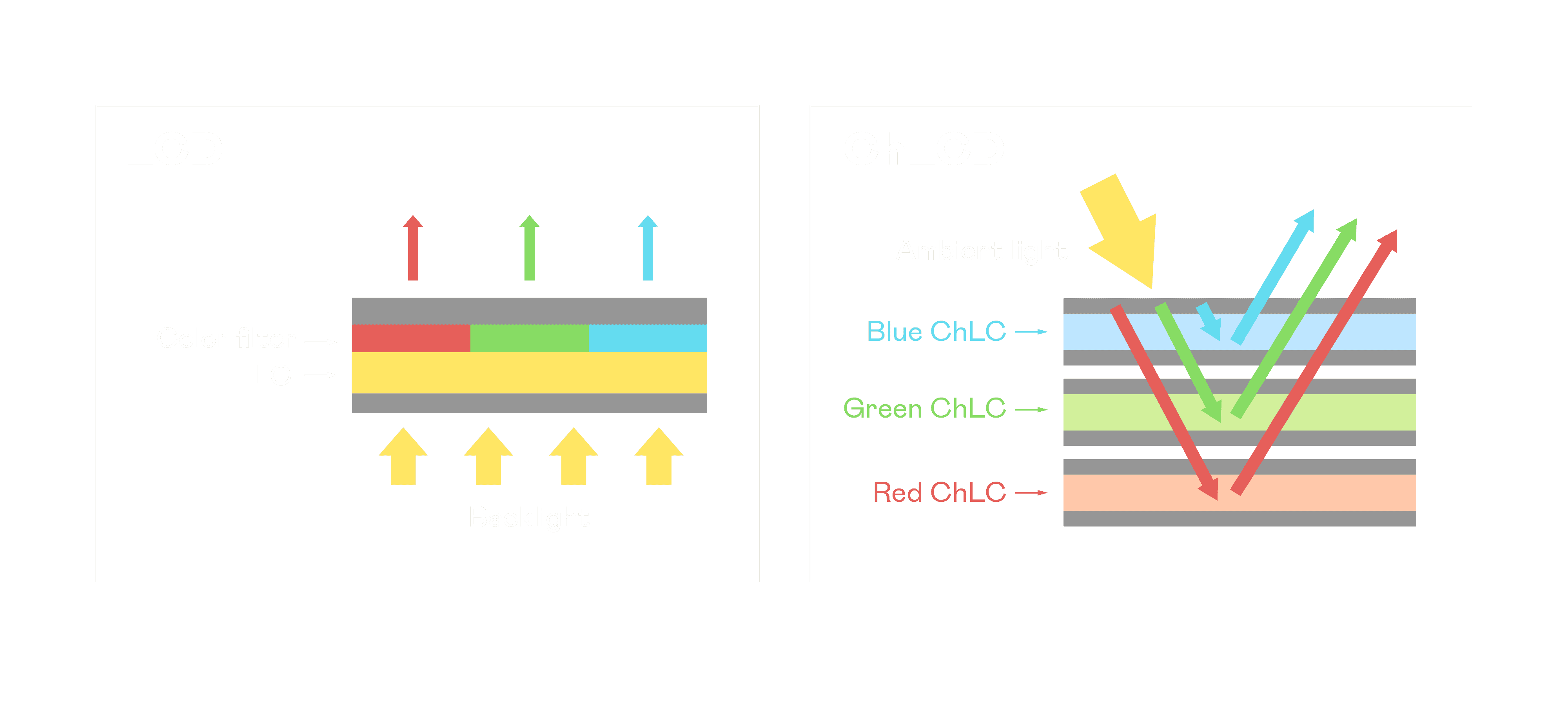 CG电子胆固醇液晶显示器是由红、、、、绿、、蓝三层胆固醇液晶面板堆叠而成,,并采用无彩色滤光片设计,,,,减少环境光在反射过程中的损耗。。。。